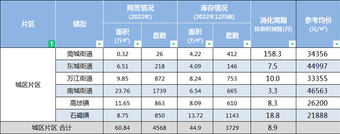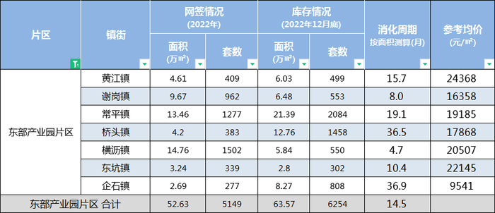 横沥镇是2022年东部产业园片区新房表现最好的镇街,全年网签面积14.76万㎡,去化周期4.7个月,去化周期仅次于南城。