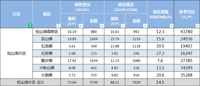 在未调整片区规划前,松山湖片区是东莞各片区覆盖镇区数量最多的片区,2022年松山湖片区的新房住宅网签面积73.04万㎡,网签套数5749套,网签面积仅次于滨海片区,居东莞各片区第二,片区去化周期为14.5个月。