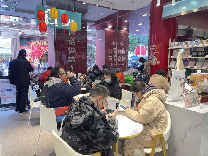 就如工作人员所说,记者环顾四周,店内几乎没有空位,特别是靠窗的位子,由于可以看到步行街街景,十分抢手。“我是这的老顾客了,每次来都会买不少东西,现在多了一个可以坐坐的店,店里人太多了,在这可以定下心来,理下买的东西,看看有没有漏掉的,顺便还能喝点东西吃个点心休息一下。”陪朋友来买东西的顾先生,喝着咖啡和记者聊了起来。