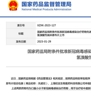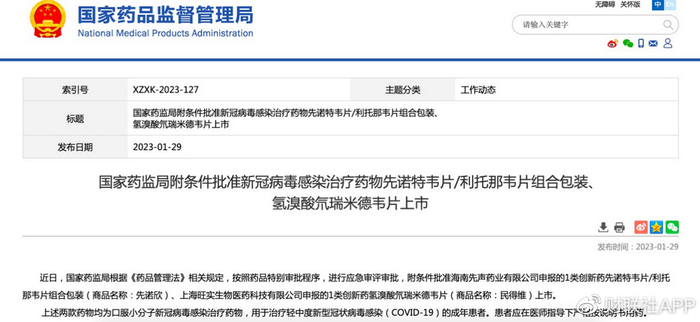 《科创板日报》1月29日讯(记者 金小莫)29日,国家药品监督管理局官网发布消息称,附条件批准海南先声药业有限公司申报的1类创新药先诺特韦片/利托那韦片组合包装(商品名称:先诺欣)、上海旺实生物医药科技有限公司申报的1类创新药氢溴酸氘瑞米德韦片(商品名称:民得维,记者注:此前,民得维的产品代号为VV116)上市。