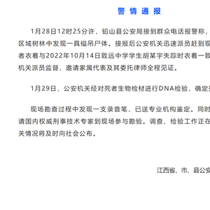 当天12时25分许,铅山县公安局接到群众电话报警称,在河口镇金鸡山区域树林中发现一具缢吊尸体。接报后公安机关迅速派员赶到现场勘查,发现死者衣着与2022年10月14日致远中学学生胡鑫宇失踪时衣着一致。随即商请检察机关派员监督,邀请家属代表及其委托律师全程见证。