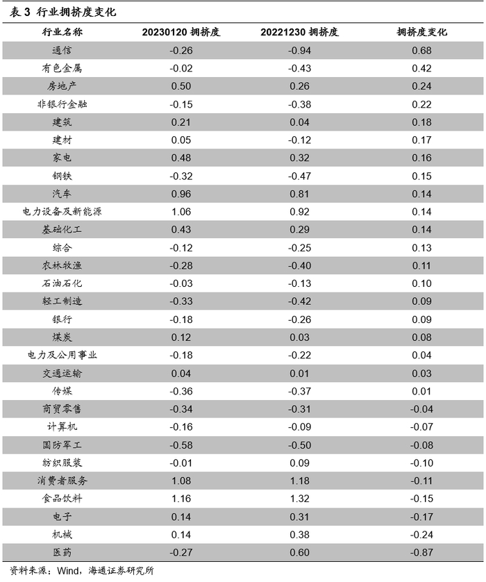3.行业拥挤度:食品饮料、消费者服务、电力设备及新能源、汽车、房地产的行业拥挤度相对较高