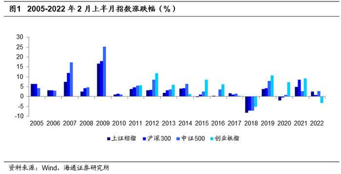 日历效应上,2005年以来,上证综指、沪深300、中证500、创业板指在2月上半月的上涨概率分别为83%、89%、94%、77%,涨幅均值分别为2.97%、3.81%、5.25%、4.51%,涨幅中位数分别为2.91%、3.32%、3.67%、6.06%,各大宽基指数均表现较好。