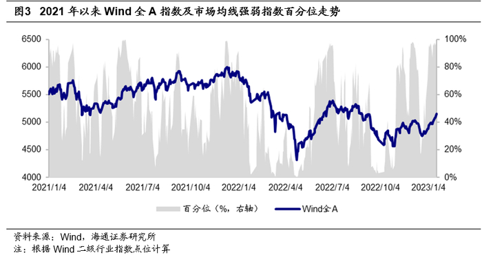 从趋势模型上看,Wind全A指数短期均线和长期均线的距离为-0.13%,高于前一周(-1.59%),市场处于震荡市,Wind全A指数处于20日均线之上。