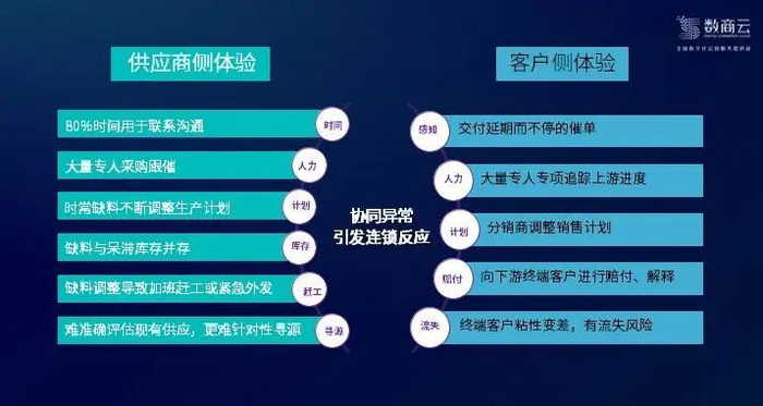 此外,基于供应商侧和客户侧的体验,它也可以场景化示例协同不当带来的不良体验,比如上游供应商、下游客户侧的一系列不良连锁反应,如果因协同导致订单延迟交付,则客户侧总体感知会很差,会不停的催单,需要大量的专人采购跟催。而供应商侧会有80%时间用于联系沟通,核心企业的业务运营会处于极其被动的状态。