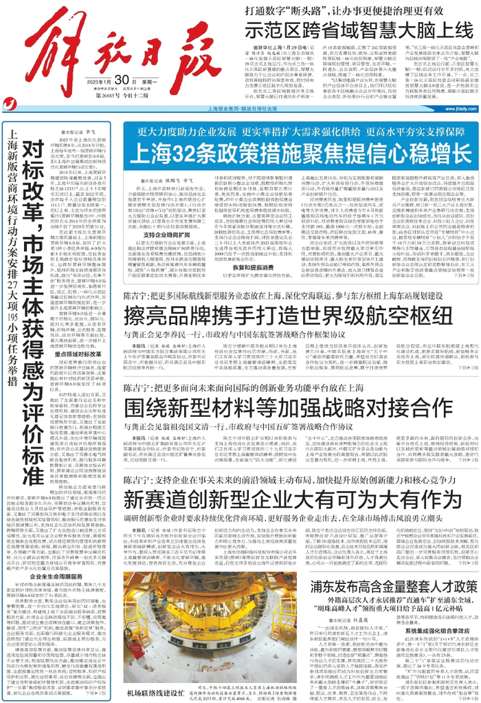 ● 市委书记陈吉宁昨天下午在调研我市部分创新型企业时指出,科技革命和产业变革正加速催生经济发展新领域新赛道,创新型企业大有可为、大有作为。要深入贯彻落实习近平总书记考察上海重要讲话精神,不断优化营商环境,强化制度供给,营造良好生态,充分激发企业创新活力和内生动力,支持企业在事关未来的前沿领域主动布局,加快提升原始创新能力和核心竞争力,为推动上海经济高质量发展作出更大贡献。