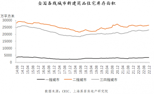 分城市能级来看,全国百城中一、二、三四线的新建商品住宅库存总量分别为3360万平方米、26572万平方米和23126万平方米,相比2021年底增速分别为7.4%、-0.1%和2.0%。从城市结构看,一线城市的库存拉升态势较为明显,这和一线城市受疫情冲击较大等因素有关。