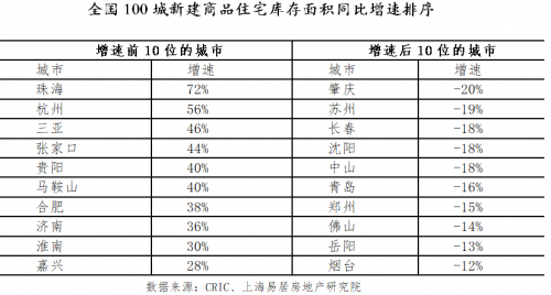 具体来看,珠海、杭州和三亚三个城市库存同比拉升较为明显,同比增速分别为72%、56%和46%;而包括肇庆、苏州和长春的库存下滑速度较快,增速分别为-20%、-19%和-18%。