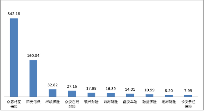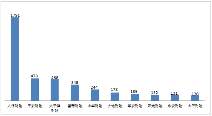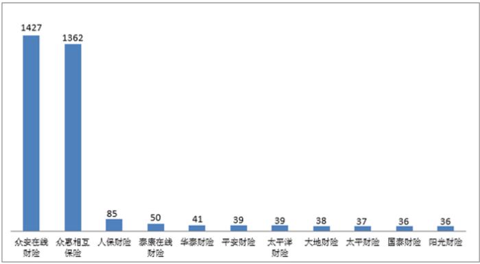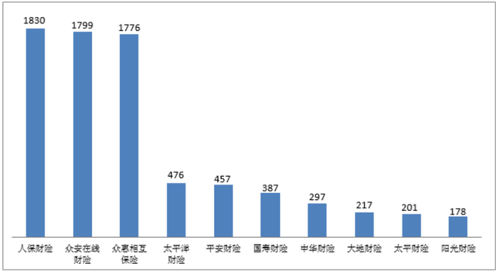 (一)财产保险公司投诉量情况。财产保险公司投诉量居前10位的为:人保财险2479件,占财产险投诉总量的20.31%;众安在线财险2000件,占比16.39%;众惠相互保险1815件,占比14.87%;平安财险813件,占比6.66%;太平洋财险684件,占比5.61%;国寿财险453件,占比3.71%;中华财险360件,占比2.95%;大地财险354件,占比2.90%;阳光财险317件,占比2.60%;太平财险236件,占比1.93%。
