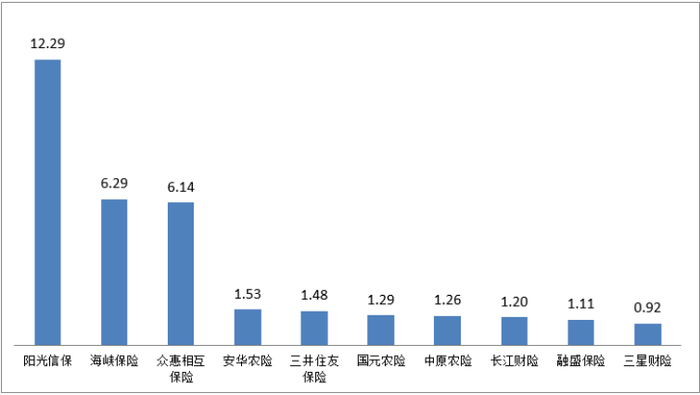 1.亿元保费投诉量情况。2022年第三季度,财产保险公司亿元保费投诉量中位数为4.37件/亿元。其中,亿元保费投诉量居前10位的为:众惠相互保险342.18件/亿元;阳光信保160.34件/亿元;海峡保险32.82件/亿元;众安在线财险27.16件/亿元;现代财险17.88 件/亿元;前海财险16.39件/亿元;鑫安车险14.01件/亿元;融盛保险10.99件/亿元;渤海财险8.20件/亿元;长安责任保险7.99件/亿元。