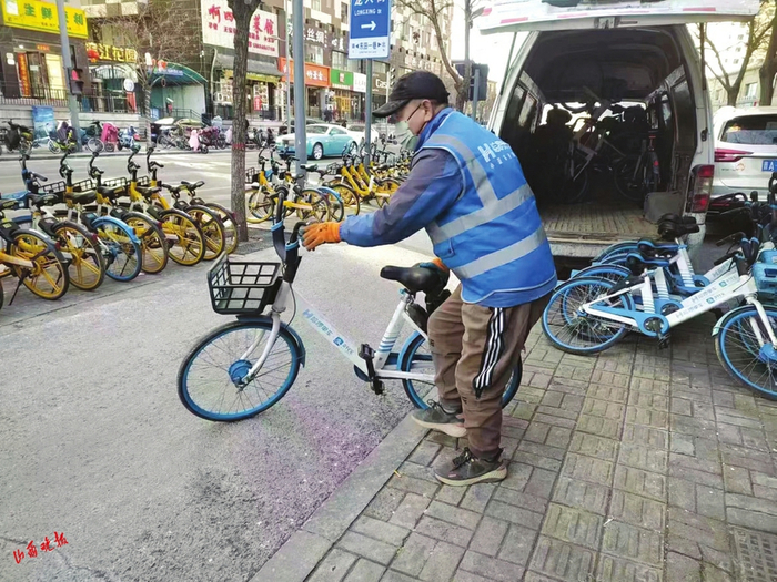 三十多斤重的单车依次被搬上车,摆放方式也很有门道,车头向外、双侧摆放,最大限度节省空间,保证车子整齐。“刚开始不会摆,一次也就放个二三十辆,现在有经验了,能放下四五十辆。”连润喜介绍,平时他一天要运送两百辆左右的单车,节假日期间随着单车使用量增多,一天则要运送三百多辆,来回六七趟。