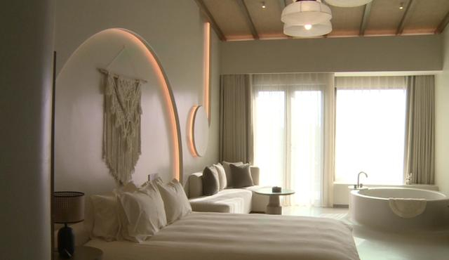 酒店秉持着人与自然和谐共生的设计理念,屋顶的印尼藤编织、崇明大米形状的氛围灯设计,以及四件套的裸棉材质,从细节处给予游客“住在大自然”的体验感。而酒店大堂的老纱布装饰品,房间内的土布玩偶和随处可见的土布工艺品,也将崇明土布这一非遗文化体现得淋漓尽致。