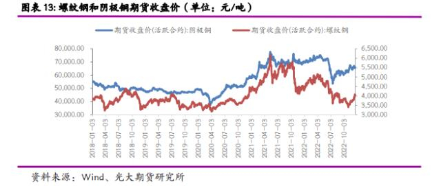 2022年全球宏观事件层出不穷,海外经济下行、美联储加息、俄乌冲突、欧洲能源危机,国内地产市场持续下行、疫情反复散发、稳增长政策力度不断加码,宏观事件对钢材价格的影响超过产业供需基本面,每一轮钢价涨跌的背后,都有比较强的宏观事件驱动。如俄乌冲突爆发,是3月钢价加速上涨的主要因素;国内疫情蔓延、地产下行及美联储加息,是导致4-10月钢材价格总体大幅下跌的主要压力;国内疫情防控优化政策出台、地产融资宽松政策不断加码,以及美联储加息节奏放缓预期,是驱动11-12月国内钢价大幅反弹的重要原因。相对来看,今年产业供需基本面,如产量、库存、表需、成交等数据变化,对钢价走势的直接影响要弱于往年。从螺纹钢和铜的价格走势对比来看,不难看出今年的相关性较往年要更强,基本处于同涨同跌的趋势,价格出现拐点的时间也基本一致,也在一定程度上印证钢价走势受宏观因素的影响相对往年更强。