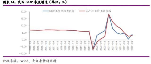今年前三季度在房地产市场深度调整及疫情蔓延等因素影响下,中国经济下行压力加大,GDP同比增速仅为3%。从季度增速来看季节性波动较大,一季度同比增长4.8%,二季度同比增长0.4%,三季度同比增长3.9%。最新公布的11月份经济数据显示消费超预期回落,出口持续下行,投资仍低于预期,就业压力上升,很多机构下调了四季度中国GDP增速至2.5%左右。预计2022年全年GDP增速在2.9%左右,是改革开放以来除2020年外的最低增速。