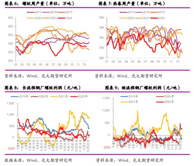 尽管2022年国家发改委表态继续开展全国粗钢产量压减工作,确保实现2022年全国粗钢产量同比下降,唐山、江苏、山东等地也下发了钢铁企业产量压减任务,但在去年上半年粗钢产量超高基数的影响下,今年粗钢产量压减完成难度并不大。且下半年各地稳经济压力较大,部分地区甚至出现地方政府要求钢厂增产的现象。相对于前几年,2022年供应端受到行政性限产的影响明显弱化,钢铁企业生产更多是根据订单以及利润情况进行调节。在钢铁产能显著过剩的情况下,钢铁产量释放取决于需求,价格也更多由需求来决定。而由于钢厂生产的连续性,钢厂主动减产意愿不足,供应端的刚性对钢材价格及钢厂利润的压制较为明显,2022年无论是现货还是盘面多数时候均没有给到钢厂利润。