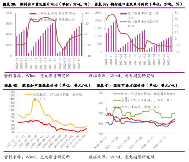 进出口层面,2022年我国钢材出口基本持平,进口大幅回落。据海关统计,1-11月全国累计出口钢材6195万吨,同比增长0.11%。其中,11月出口钢材559万吨,同比增加28.21%。1-11月全国累计进口钢材986.7万吨,同比下降25.64%。其中,11月进口钢材75.2万吨,同比下降47.04%。1-10月累计进口钢坯604.45万吨,同比减少468万吨,降幅43.64%。累计出口钢坯92.25万吨,同比增加91.84万吨。把钢材折算成粗钢计算,1-11月我国粗钢净出口4975万吨,同比增加1058万吨,增幅达27%。粗钢净出口大幅增加,在一定程度上缓解了国内供应压力。2023年,随着欧美主要国家货币政策持续收紧效应显现,海外经济增速面临进一步下降,汽车、工程机械等耐用口消费下降,叠加目前国内外价差不大以及钢厂盈利不佳,预计2023年我国钢材进出口均将出现回落。预计全年钢材出口量5600万吨左右,较2021年下降约1100万吨,进口900万吨左右,较2021年下降约150万吨,粗钢净出口或将较2021年减少900万吨左右。