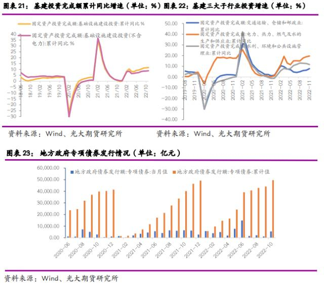 中央经济工作会议将明年的重要工作中扩大国内需求放在了首要位置,基建投资仍为宏观政策的主要抓手,通过政府投资和政策激励有效带动全社会投资,加快实施“十四五”重大工程,加强区域间基础设施联通,鼓励和吸引更多民间资本参与国家重大工程和补短板项目建设,基建投资或依然保持高位运行。根据Wind数据,截至11月中旬2022年地方政府新增专项债发行规模破4万亿元,为历史新高,且财政部已下达地方债“提前批”额度,相较往年下发时间更早。2022年专项债发放节奏较快,但受各地疫情影响,各地基建项目动工进度略低于预期,积累了不少项目和资金,2023年随着疫情防控优化效应显现,将有效加快项目赶工进度,加速实物工作量落地。不过考虑到2022年基建投资基数较高,地方财政收支压力较大,以及中央经济工作会议提出“保持必要的财政支出强度,保障财政可持续和地方债务风险可控”,预计2023年基建投资增速或将有所放缓,全年增速在6%左右。