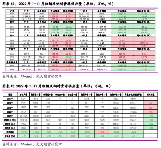 2022年我国钢材坯进口延续大幅下降,1-11月全国累计进口钢材986.7万吨,同比下降25.64%。其中,11月进口钢材75.2万吨,同比下降47.04%。1-10月累计进口钢坯604.45万吨,同比减少468万吨,降幅43.64%。假设11月钢坯进出口维持在10月份水平,把钢材折算成粗钢计算,1-11月我国粗钢净出口4975万吨,同比增加1058万吨,增幅达27%。粗钢净出口大幅增加,在一定程度上缓解了国内供应压力。