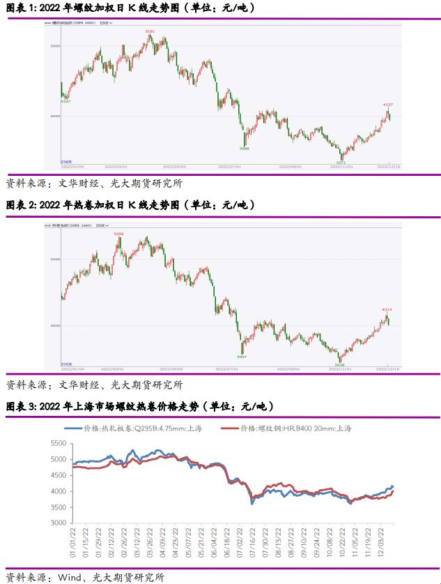 从具体运行节奏来看,年初稳增长政策不断发力,提升市场预期,钢材价格稳步上涨,2月底俄乌冲突爆发,海外钢价大涨,其中欧洲热卷价格一度突破1600美元/吨创历史新高,国内钢价也加速上涨,3月召开的两会提出全年经济增长5.5%的目标,以及1-2月份地产、基建数据超预期好转,进一步提升市场预期,螺纹、热卷价格在4月初均突破5000元/吨关口。4月份国内疫情多点散发,多地实施静态管理,地产、汽车等数据大幅回落,钢材需求在传统消费旺季逆季节下行,使得市场形势急转直下,钢价转入持续下跌走势。至5月25日全国稳经济大盘会议召开,市场预期有所企稳,钢价也出现一轮短暂反弹。进入6月份成材需求持续低迷,地产市场停工潮及断供断贷连续出现,美联储在6月大幅加息75基点,引发全球风险资产价格普遍大幅下跌,钢材市场信心也再度弱化,多家钢厂表态钢铁行业寒冬来临,进行减产并减少原料采购,原料价格加速下跌,行业出现一轮负反馈的共振下跌走势,此轮下跌一直持续到7月中旬。7月下旬在产量及库存降至低位的情况下,部分终端开始加大成材补库,钢厂也加大原料补库,市场悲观情绪有所缓和,价格表现为涨跌频繁切换的区间震荡走势,并一直持续到9月底。国庆节后地产市场风险事件频发,国内疫情多点散发,美联储大幅加息导致美元持续上行,多重利空因素作用下钢价出现新一轮大幅下跌,至10月底的价格跌至近两年多新低。11月以后地产融资宽松政策不断出台,央行降准、降息,国内疫情优化措施出台,美联储加息预期阶段放缓,国内市场转入弱现实、强预期阶段,期货价格从底部持续拉涨,现货市场表现弱势,基差一度从400元/吨收窄到-100元/吨的水平,到12月份现货价格上涨幅度也有所加大,螺纹、热卷期现货价格均重回到4000元/吨关口上方。