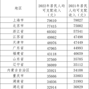 2022年,上海和北京居民人均可支配收入超过7万元,遥遥领先其他省份。数据显示,上海2022年居民人均可支配收入达79610元,逼近8万元,居全国之首。北京仅次于上海,居全国第二位,为77415元。北京的居民人均可支配收入在2021年首次突破7万元,而上海于2020年突破7万元大关。
