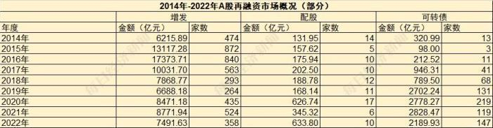 2022年,A股上市公司再融资(含定向增发、公开增发、配股、优先股、可转债发行等融资方式)规模出现小幅下滑。据Wind数据统计,2022年,A股再融资募集资金总额为10738.3亿元,其中定向增发募集资金总额7491.63亿元、配股募集资金总额633.8亿元,可转债募集资金总额2189.93亿元(含强制赎回和回售金额)。