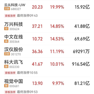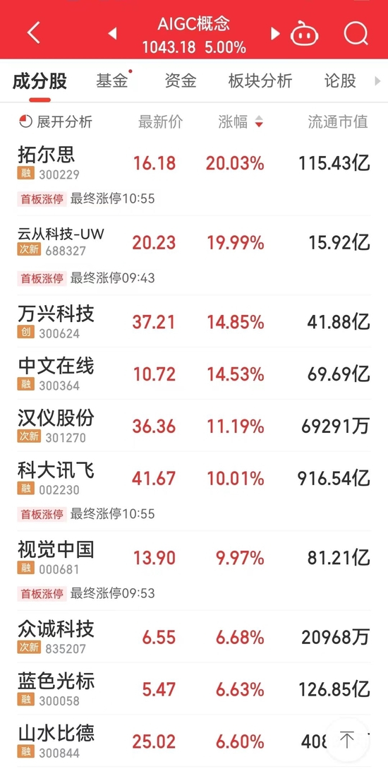 1月30日,AIGC概念股早盘大涨。截至午间收盘,拓尔思(300229)、云从科技(688327)、科大讯飞(002230)、视觉中国(000681)纷纷涨停。