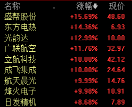 截至发稿,立航科技、成飞集成、航天晨光等涨停,盛邦股份、东方电热、光韵达等涨幅居前。