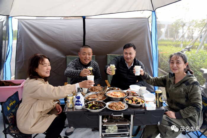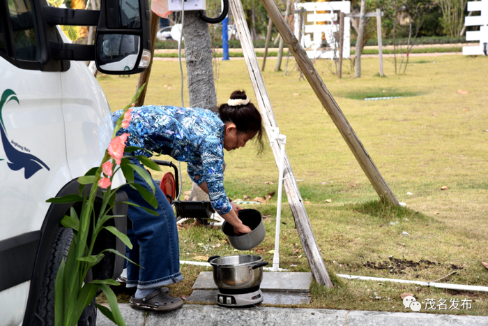 在一辆醒目的红色房车旁,来自吉林的房车游客齐铁和妻子正准备做丰盛的晚餐,看到记者过来采访,热情健谈的他放下手中的活,开心地分享起在茂名的旅居生活。