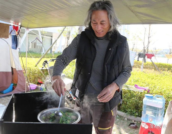 在茂名的日子,休闲也惬意。平时李平会到歌美海边散步,也会采些野花装饰自己的帐篷,整一个温馨的感觉。他感觉茂名这边很适合避寒和养老,“茂名是一座热情的城市,这里的环境很好,下次我还会再来。”