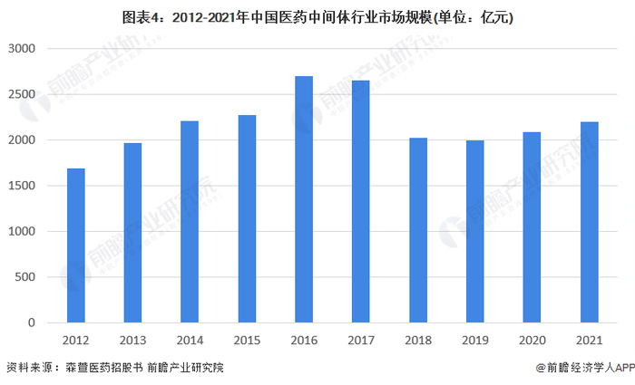 医药中间体与化学原料药生产方法类似,故我国化学原料药生产企业通常也生产医药中间体产品,其发展水平与化学原料药和化学药品制剂的发展密切相关。根据森萱医药招股书数据显示,2012-2017年,我国医药中间体市场规模整体呈上升趋势,2018年,我国医药中间体市场规模下降至2017亿元。随着大量专利药到期,仿制药将给医药中间体带来广阔的市场空间和良好的发展机遇。前瞻初步测算,2021年,中国医药中间体行业市场规模约为2200亿元。