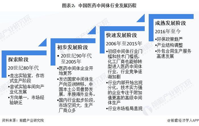中国医药中间体行业在我国主要经历四个发展阶段,分别为探索阶段(20世纪80年代)、初步发展阶段(20世纪90年代至2005年)、快速发展阶段(2006年至2015年)以及成熟发展阶段(2016年至今),经过30多年的稳步发展后,我国医药生产所需的化工原料和中间体基本能够配套,只有少部分合成技术复杂的高端中间体需要通过进口来满足,而且由于我国资源比较丰富,原材料价格较低,目前有许多中间体实现了大量出口。