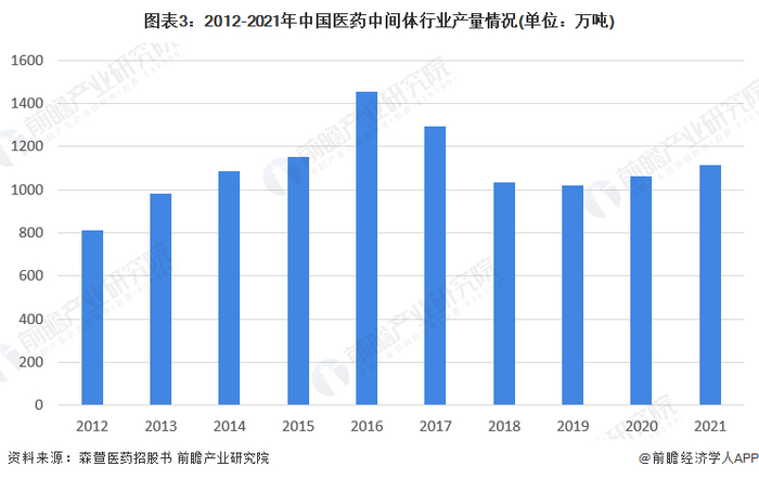 在医药中间体行业发展初期,因投资较小,利润水平高于普通化工产品,而市场准入门槛又比较低,导致大量的小型化工企业加入了医药中间体领域。根据森萱医药招股说明书公布的数据显示,2016年以前我国医药中间体产量不断增长,2016年,我国医药中间体产量达到峰值,约为1453万吨。2016年以来,我国医药中间体行业市场化程度不断提高,整体呈现中小企业为主、生产区域集中、业务规模稳定、工艺技术水平较低、产品同质化严重等特征,同时受环保压力的影响,我国医药中间体产量有所下滑;但2020年和2021年,受疫情影响,国际社会对一些与抗疫相关的原料药需求旺盛,因此部分原料药需求有所回升,一定程度上也刺激了医药中间体行业的发展。2018年我国医药中间体产量为1032万吨,前瞻根据下游原料药市场需求情况、医药中间体市场发展状况以及新冠疫情的刺激作用综合测算,2021年中国医药中间体产量约为1113万吨。