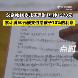 【#父亲教10岁儿子理财1年挣1570元#:累计满50元便支付给孩子10%的利息】#孩子的理财意识要不要从小培养#近日,山东济南。父亲给10岁儿子制定了通过劳动获得收入的理财计划,奖罚分明,每当累计满50元,父母保管一个月以上便会支付给孩子10%的存款利息。徐一杰称:自己从2022年1月开始做理财计划,1年间共收入1570元,这一年自己最大的变化就是不乱花钱了,如看中价格高些的商品会等打折时再买。父亲徐先生称:制定理财计划是为了让孩子养成良好的理财习惯,体会挣钱不易,通过存款获得利息的方式,让孩子感受到理财的乐趣。@点时新闻
