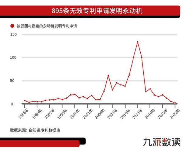 作为专利的大国,在“有效”的专利之外,还存在许多让人啼笑皆非的“无效”专利申请。根据企知道专利数据库,从1986年至2022年被驳回与撤销的专利申请中,竟有895条宣称自己发明了永动机,最高单人就申请了上百条“永动机”的发明专利。