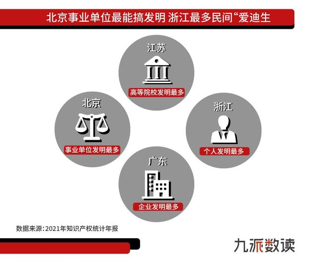 广东的主力军来自企业,发明专利有效量居全国榜首,占全国企业发明专利总数的20%;北京则是事业单位最爱搞发明,科研机构和事业单位的发明专利有效量居全国第一;江苏属于搞发明的“学院派”代表,高等院校的发明专利有效量居全国第一;浙江则是有众多“民间爱迪生”,个人发明专利有效量居全国之首。