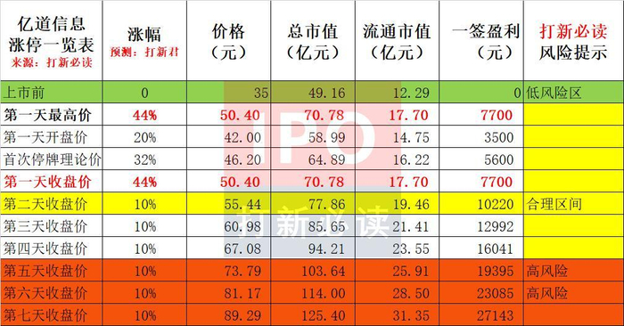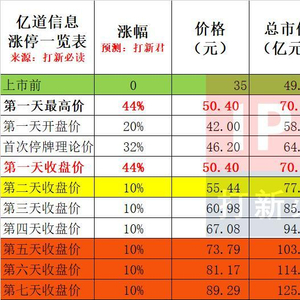 预测表格说明:黄色为打新君预测的开板价格和天数,绿色为低风险区间,红色为高风险区间。在过去的几年里,根据统计数据正确率在72-78%区间,统计口径为开板价格±20%。科创板合理、高、低风险区间表示前五天可能面临的价格,其中低风险区预示价值凸显,高风险区间为炒作风险区间。$亿道信息(001314)