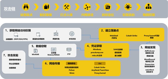 勒索病毒攻击链包含了“侦查踩点、制定策略、打点入侵、内网渗透、目标定位、实现目的、稳固权限”7个阶段,在每个攻击阶段都有不同的攻击方式组合。比如获取网络访问权限阶段,可以采用RDP、SSH等远程桌面暴力破解,或者去攻击高危端口的方式;在获取一定的权限后,再通过webshell、代理隧道的方式将勒索病毒落地,然后再通过内网渗透的方式,去进一步污染更多的服务器,从而达到目标系统并实施勒攻击。