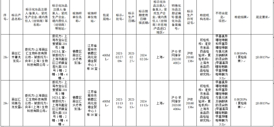 标示上海苗丝汇生物科技有限公司委托央丰(上海)生物科技有限公司生产的苗丝汇米糠洗发乳、苗丝汇何首乌洗发露,不符合规定项目均为甲基氯异噻唑啉酮和甲基异噻唑啉酮与氯化镁及硝酸镁的混合物(甲基氯异噻唑啉酮:甲基异噻唑啉酮为3:1),其检验结果分别为0.00194%(复检结果)、0.00203%(复检结果),规定要求均为≤0.0015%,初检机构均为淮安市食品药品检验所,复检机构均为上海市食品药品检验研究院。