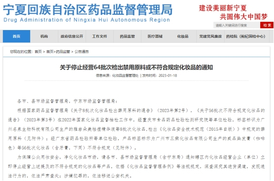 宁夏回族自治区药品督管理局表示,为保障公众用妆安全,净化化妆品市场,请各市、县市场监督管理局(含宁东局)通知辖区内化妆品经营企业(单位)立即停止经营上述提及的不符合规定的化妆品等产品,依据《化妆品监督管理条例》等法规规定,深查深究其进货渠道,发现违法行为的,依法严肃查处;涉嫌犯罪的,依法移送公安机关。