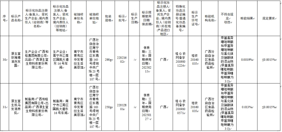 标示广西和桂集团有限公司生产的源生堂玫瑰精油洗发露、源生堂生机乌发滋养乳,不符合规定项目均为甲基氯异噻唑啉酮和甲基异噻唑啉酮与氯化镁及硝酸镁的混合物(甲基氯异噻唑啉酮:甲基异噻唑啉酮为3:1),其检验结果分别为0.0019%、0.013%,规定要求均为≤0.0015%,检验机构均为广西壮族自治区食品药品检验所,出品商均为广西源生堂生物科技股份有限公司。