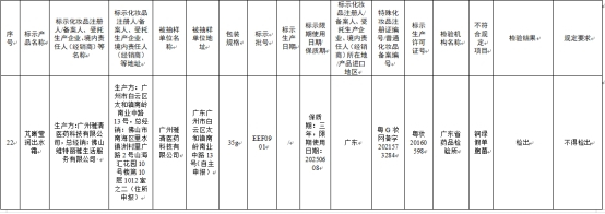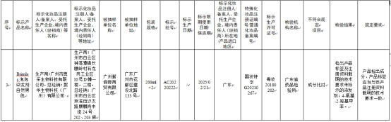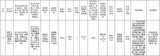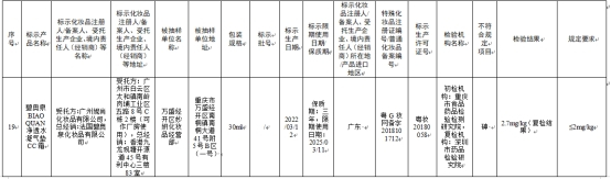 其中56批次不符合规定化妆品信息显示,标示广州市奥采生物科技有限公司生产的Brimles泡泡染发剂自然黑色,检出产品标签及注册资料载明的技术要求未标示的染发剂:4-氨基-2-羟基甲苯。其不符合规定项目为成分比对,检验机构为广东省药品检验所,总经销为聚华生物科技(广州)有限公司。