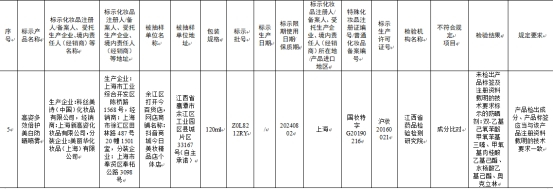 标示科丝美诗(中国)化妆品有限公司生产的高姿多效倍护美白防晒喷雾,未检出产品标签及注册资料载明的技术要求标示的防晒剂:双-乙基己氧苯酚甲氧苯基三嗪、甲氧基肉桂酸乙基己酯、水杨酸乙基己酯、奥克立林。其不符合规定项目为成分比对,检验机构为江西省药品检验检测研究院,经销商为上海新高姿化妆品有限公司,分装企业为美丽华化妆品(上海)有限公司。