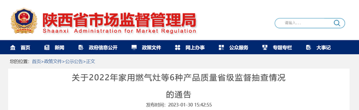 陕西省市场监督管理局公布2022年家用燃气灶等6种产品质量省级监督抽查情况