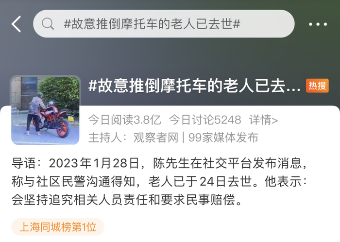 上海一老人故意推倒摩托车,拒不赔偿后去世!车主已搬离,放话追责到底