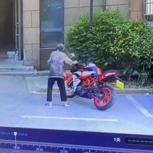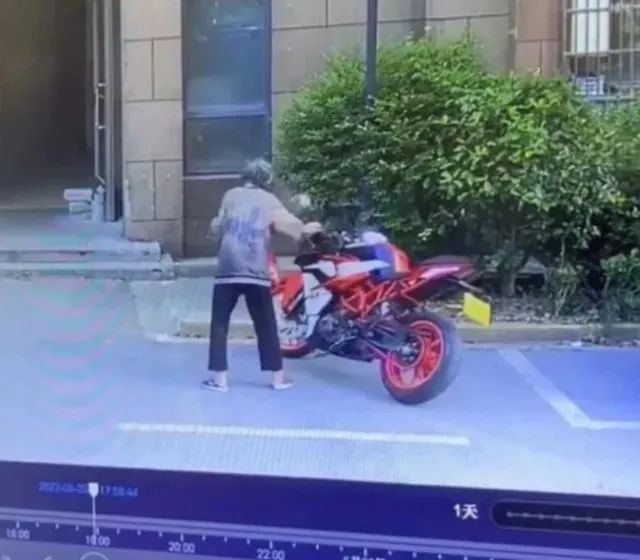 据悉,陈先生的摩托车型号为KTM-rc390,落地价格约6万元,一百多公斤重的摩托车,不用大力碰撞很难倒地。第二天,陈先生和物业一起调取了小区公共视频,惊讶地发现竟是一位路过的老人所为。