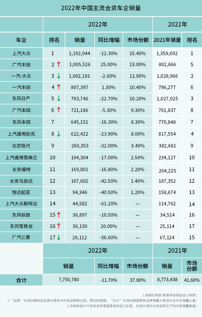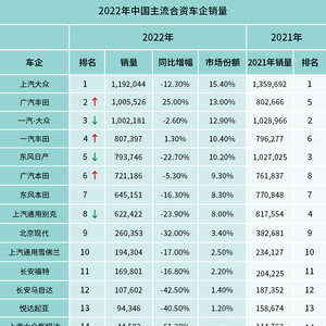其中,上汽大众和一汽-大众再次占据前三名中的两席,销量分别为1,192,044辆和1,002,181辆,分别同比下降12.3%和2.6%。与2021年不同的是,本年度一汽-大众的销量被广汽丰田超越,只能屈居第三名。