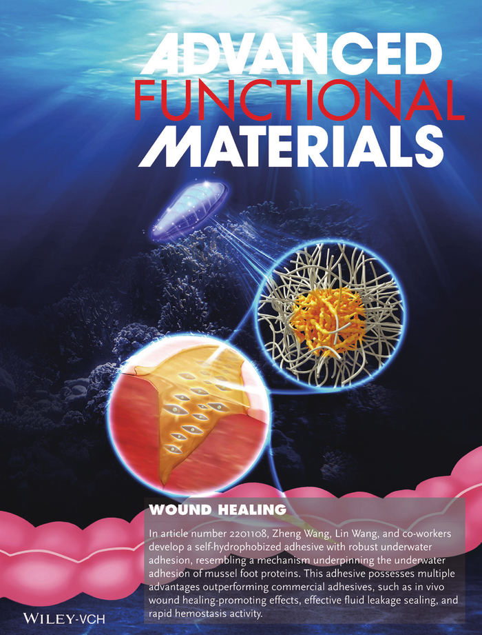 以丝胶生物材料为基础,王琳团队研制出一种具有强大水下粘附力的仿生自疏水粘合剂,可高效粘合创面伤口,封堵液体渗漏,促进体内伤口愈合。该成果于2022年5月刊登于国际顶级期刊《先进功能材料》封面