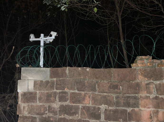 在山腰处,很容易看到校园内的建筑。学校紧贴金鸡山的围墙上面安装了多个监控和铁丝网,从二者的外观来看,装上的时间并不久。当有人靠近围墙时,监控会发出警告:“您已进入监控区域,请尽快离开。”