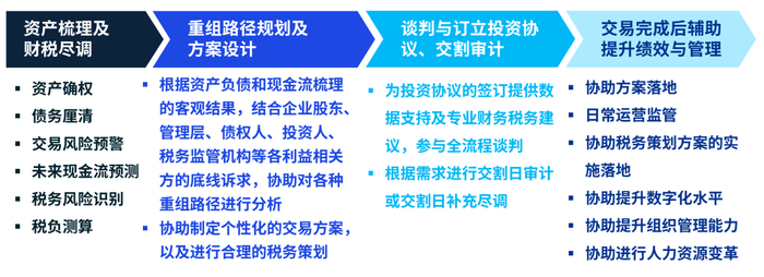 毕马威拥有专业且经验丰富的团队,熟稔地产运营特性与价值属性,同时富有资产重组及债务重组经验,能够协助市场参与方处理交易过程中面临的难点和挑战,通过快速且精准的财务分析,梳理出目标公司的资产负债状况和未来现金流,并制定个性化的服务交易方案,为相关方提供全流程的专业服务,包括但不限于:前期的财务和税务尽调、重组路径规划和方案设计、交易过程中的各方谈判、方案的最终签订、交易完成后的方案执行和企业运营监管等。
