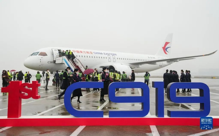 2022年12月9日,国产大飞机C919的全球首家用户东航,正式接收首架C919飞机。这是国产大飞机C919停在上海虹桥机场停机坪上。